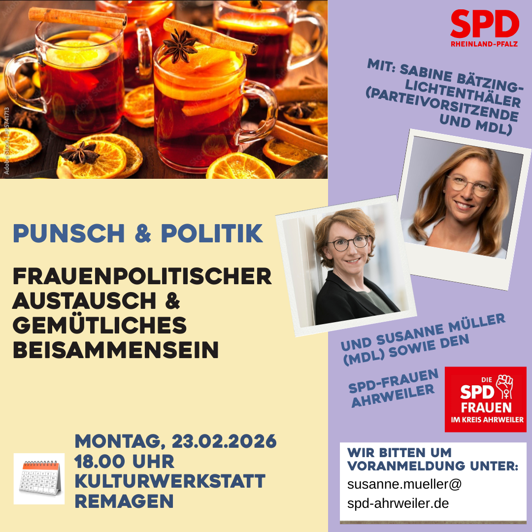Wegen Krankheit muss die geplante Veranstaltung der Landtagsabgeordneten Susanne Müller (MdL) mit Bettina Brück zum Thema „Kita“ am Montag, 2.2.2026 um 18.00 Uhr in Bad Breisig leider verschoben werden. Die Veranstaltung wird nun am Montag, den 02.03.2026 um 18.00 Uhr durchgeführt. Der Veranstaltungsort bleibt gleich. Eine gesonderte Einladung wird noch einmal zeitig veröffentlicht. Bereits erfolgte Anmeldungen behalten ihre Gültigkeit.