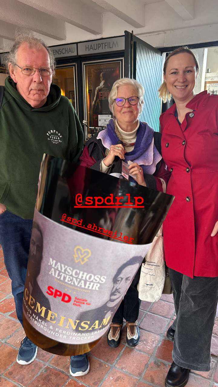 Die SPD Bonn hatte für den 1.3.26 zum Film „Unten – Im Ortsverein“ eingeladen. Darin geht es um Parteien und Partizipation, um Beteiligung und Teilhabe. Die AG SPD 60plus Kreis Ahrweiler besuchte deshalb die SPD Bonn und nimmt natürlich auch eine Flasche Wein mit als Dankeschön für die Arbeit. Es ist aber nicht irgendeine Flasche, sondern NE JOODE RUUDE: GEMEINSAM SPD –Ahrwein mit Geschichte un...
